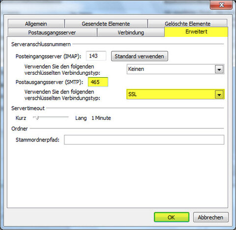 6. Im Registerblatt Erweitert wählen Sie bei Verwenden Sie den folgenden verschlüsselten Verbindungstyp: SSL undgeben Sie beim Postausgangsserver (SMTP) den Port 465 ein