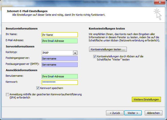 4. Wählen Sie IMAP und geben Sie Ihre Benutzerangaben an