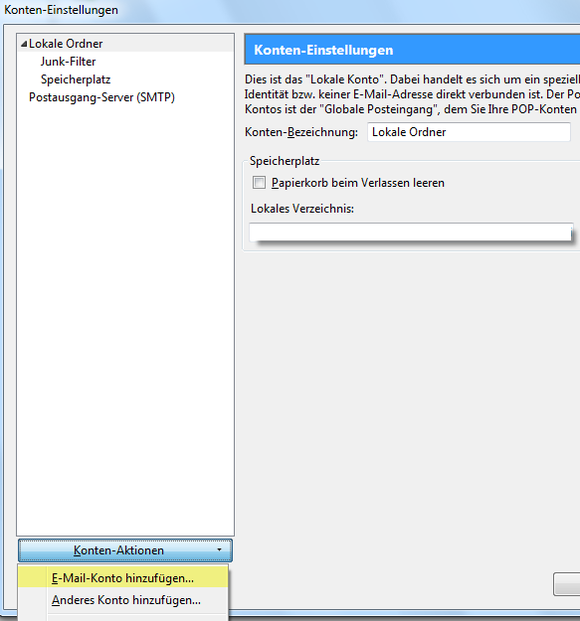 2. Klicken Sie auf Konten-Aktionen und anschliessend auf E-Mail-Konto hinzufügen.