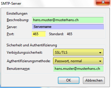 7. Geben Sie Ihre vollständige E-Mail-Adresse ein. Aktivieren Sie SSL und geben Sie den Port 465 ein.