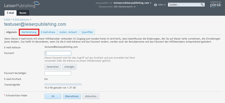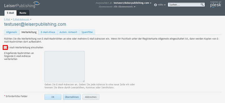 4. Aktivieren Sie E-Mail-Weiterleitung einschalten aus und definieren alle weiteren Optionen.